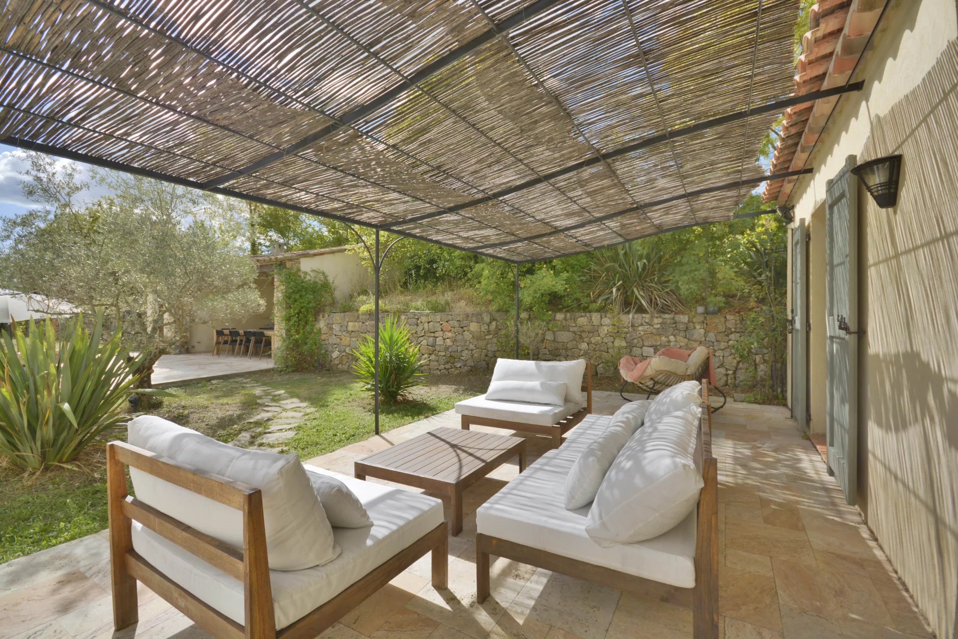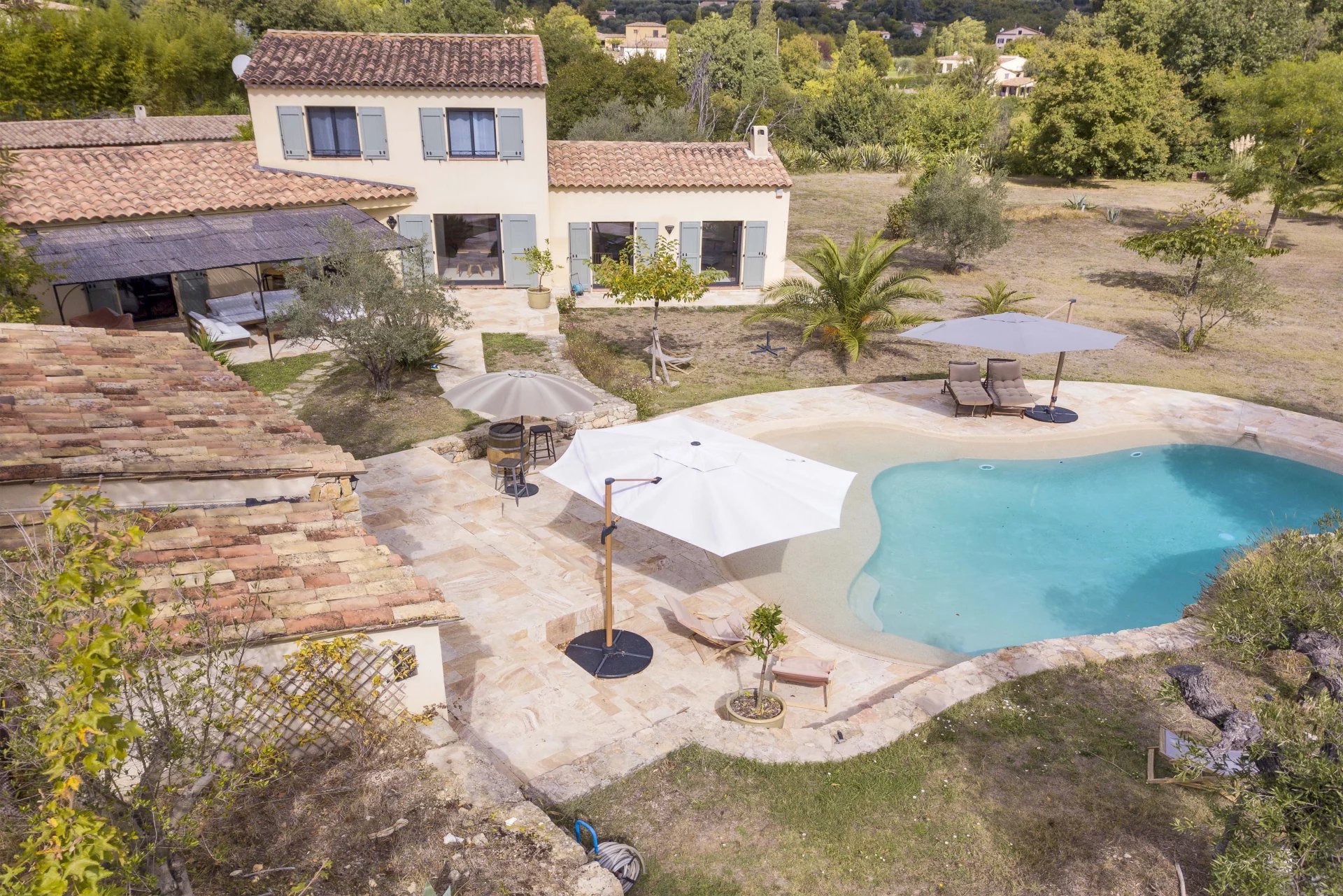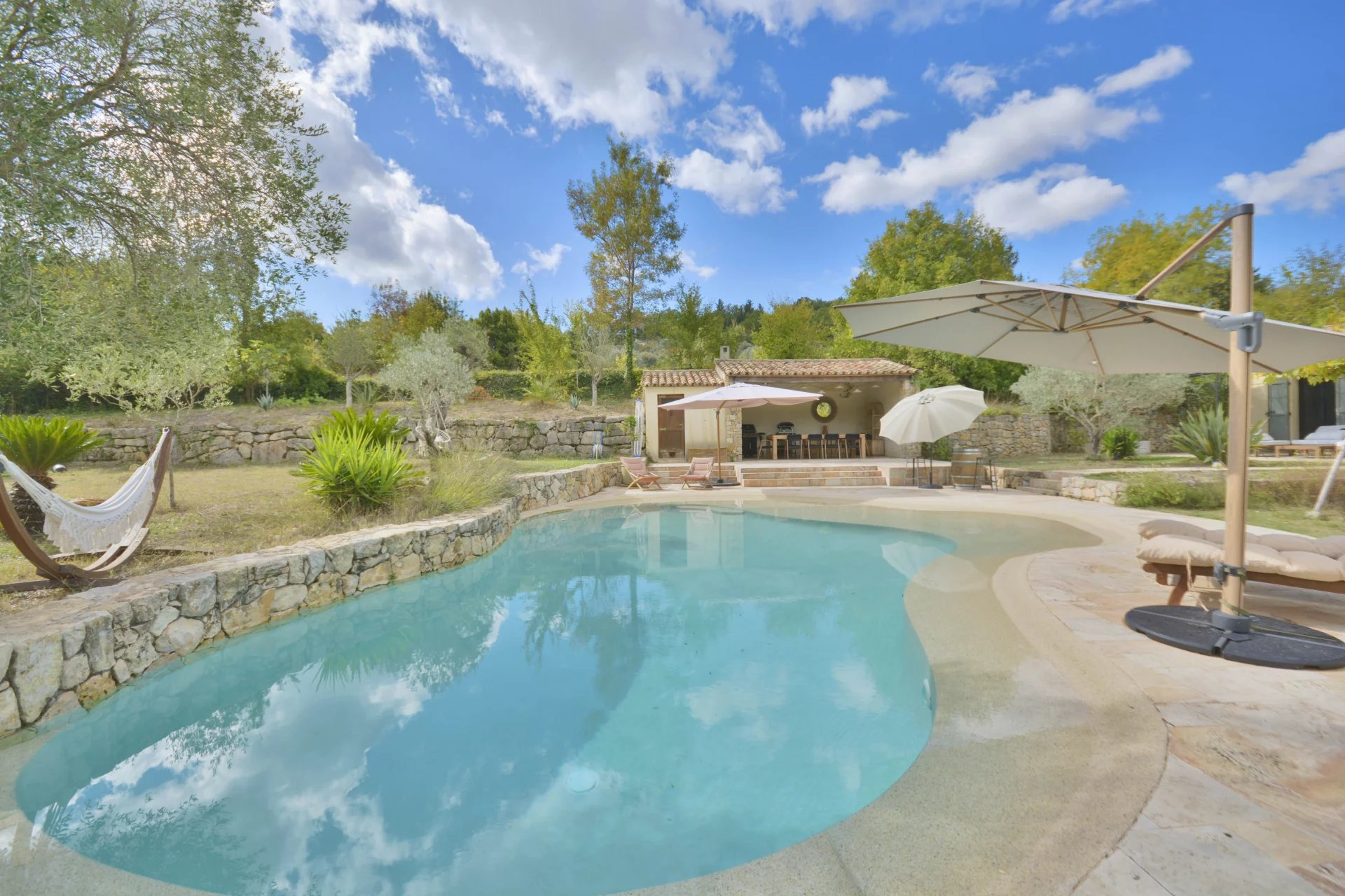 Grasse : situated 10 minutes away from Valbonne, beautifully renovated provencal-stule villa with a South exposition in a perfectly quiet and sought-after neighborhood, composed of : entrance hall, vast and bright living / dining room, fully equipped open-plan kitchen, laundry / facility room, master suite and 3 other bedrooms. Flat landscaped garden of 5 000 m² with a lovely pool area and pool house. Double garage, car port, workshop and numerous parking facilities.