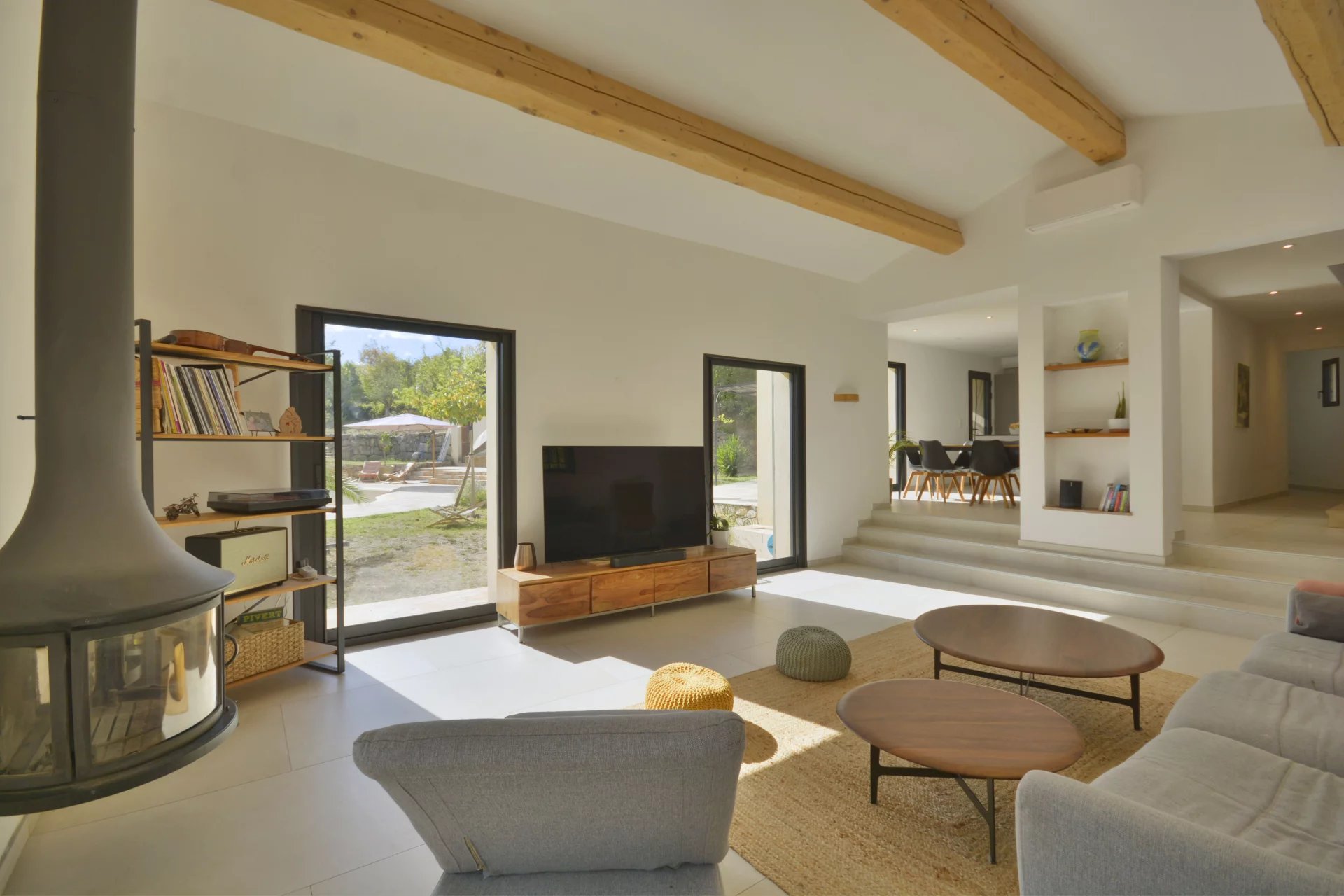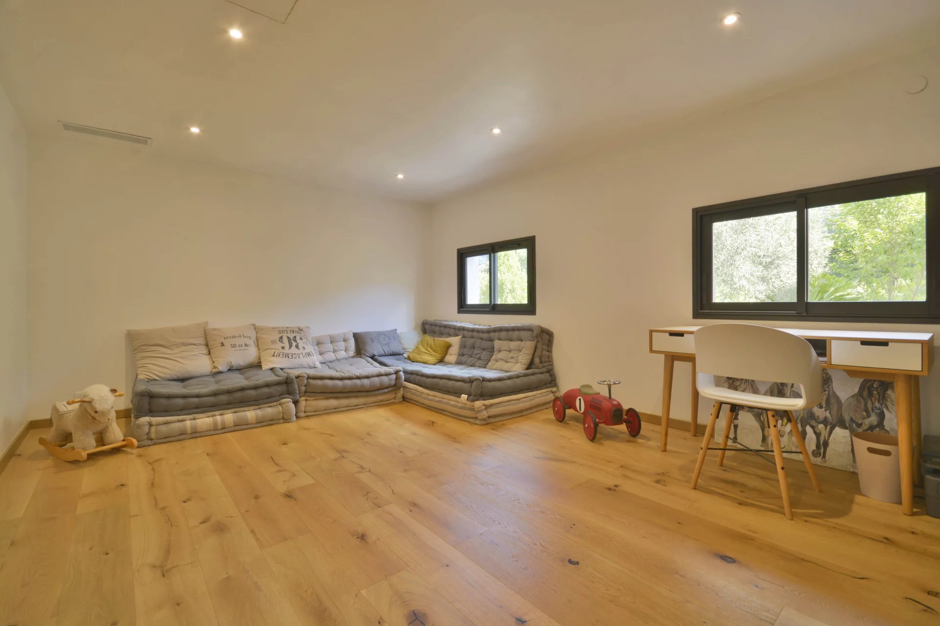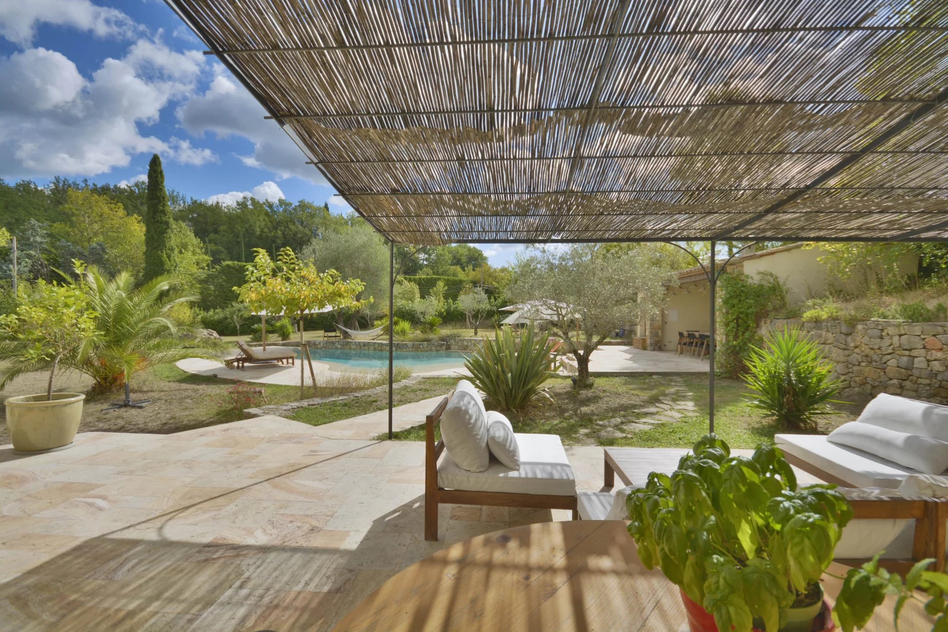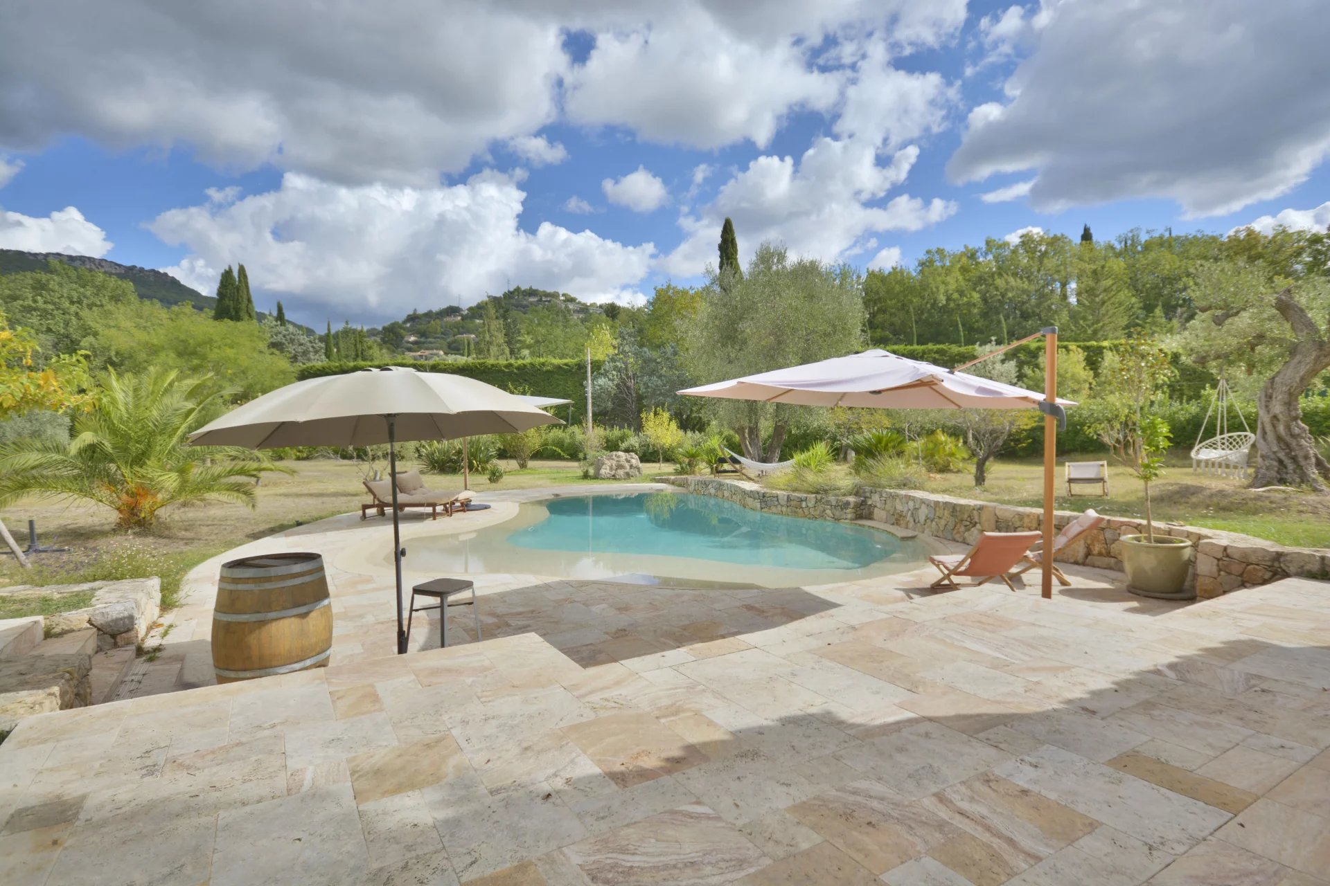 Grasse : situated 10 minutes away from Valbonne, beautifully renovated provencal-stule villa with a South exposition in a perfectly quiet and sought-after neighborhood, composed of : entrance hall, vast and bright living / dining room, fully equipped open-plan kitchen, laundry / facility room, master suite and 3 other bedrooms. Flat landscaped garden of 5 000 m² with a lovely pool area and pool house. Double garage, car port, workshop and numerous parking facilities.
