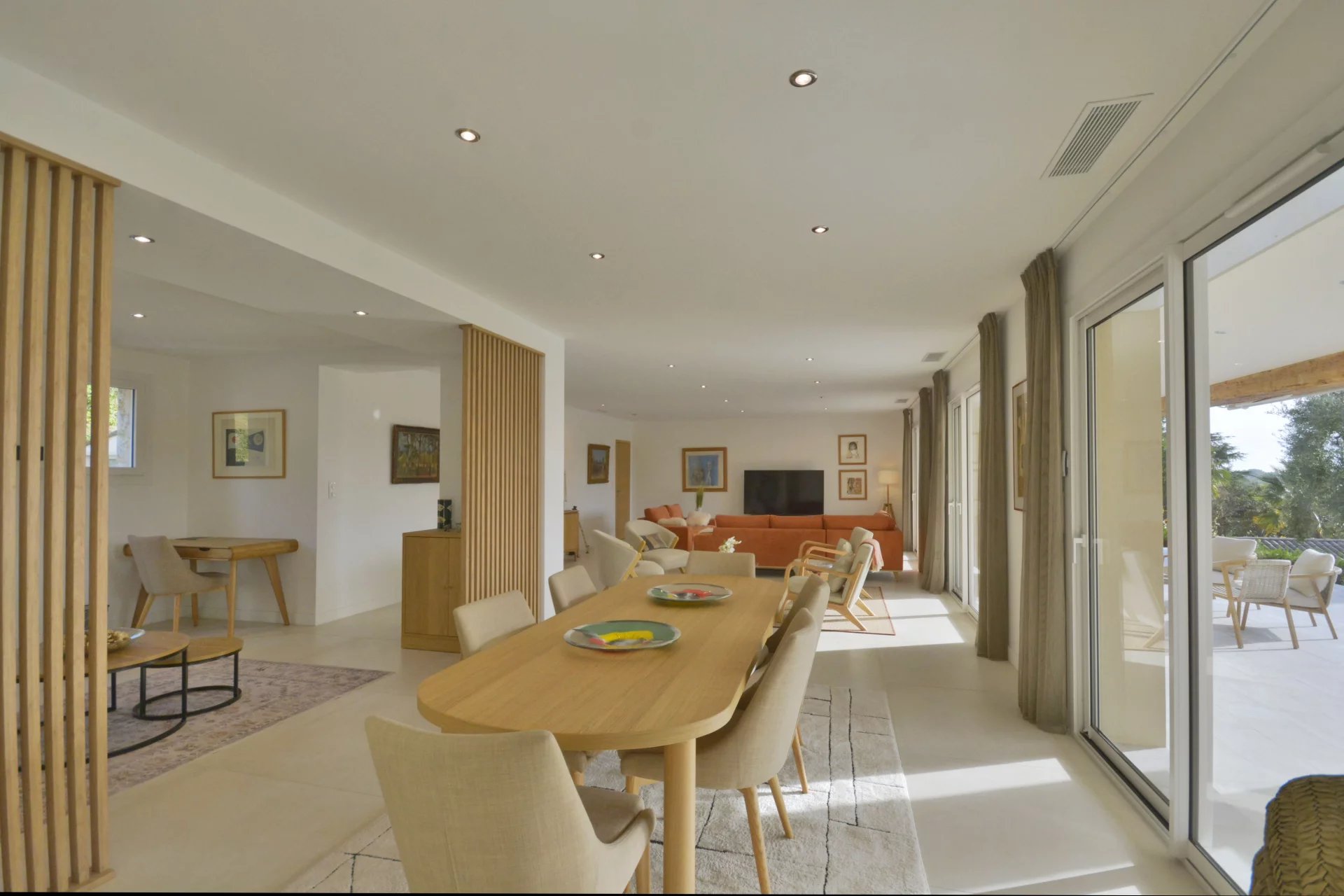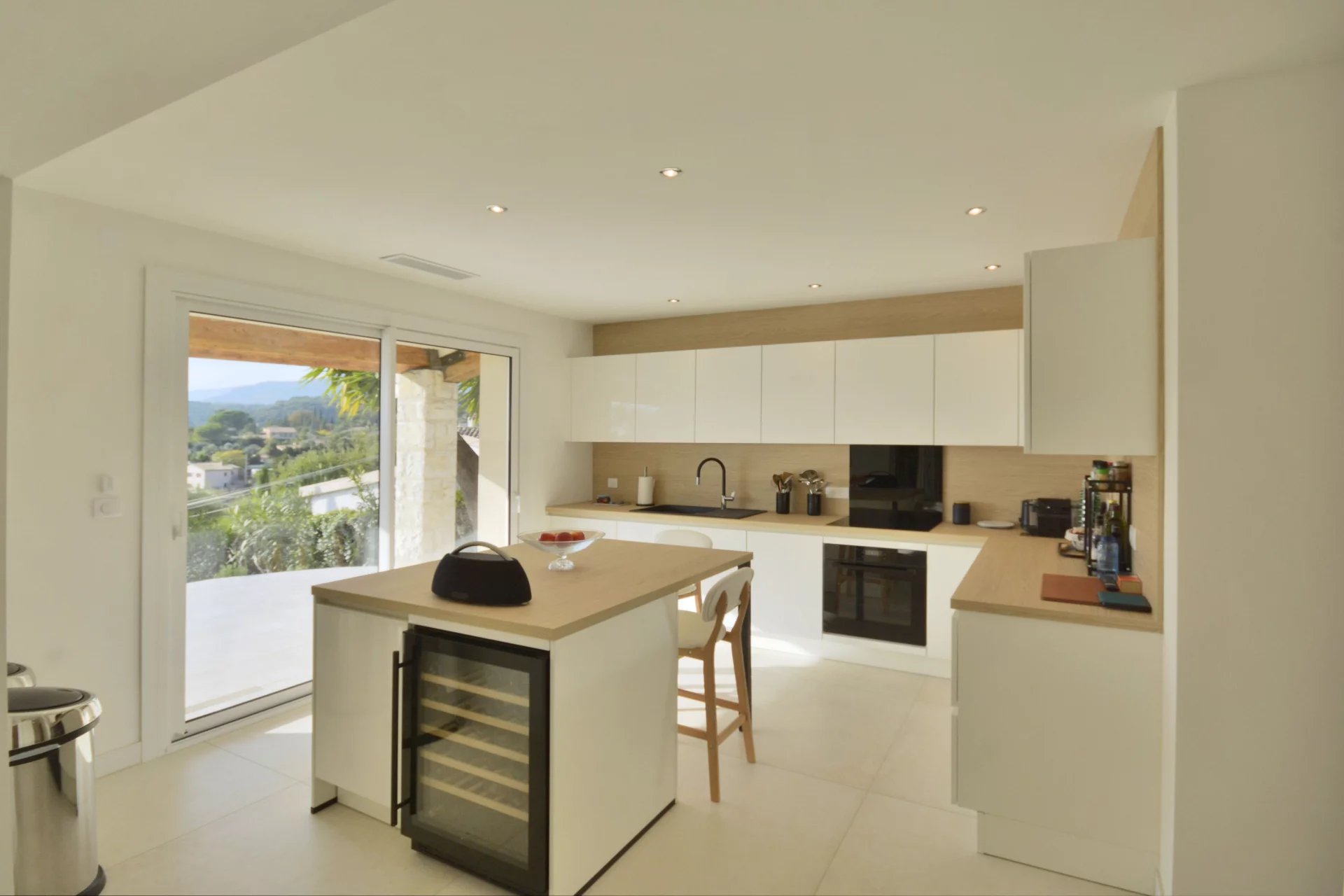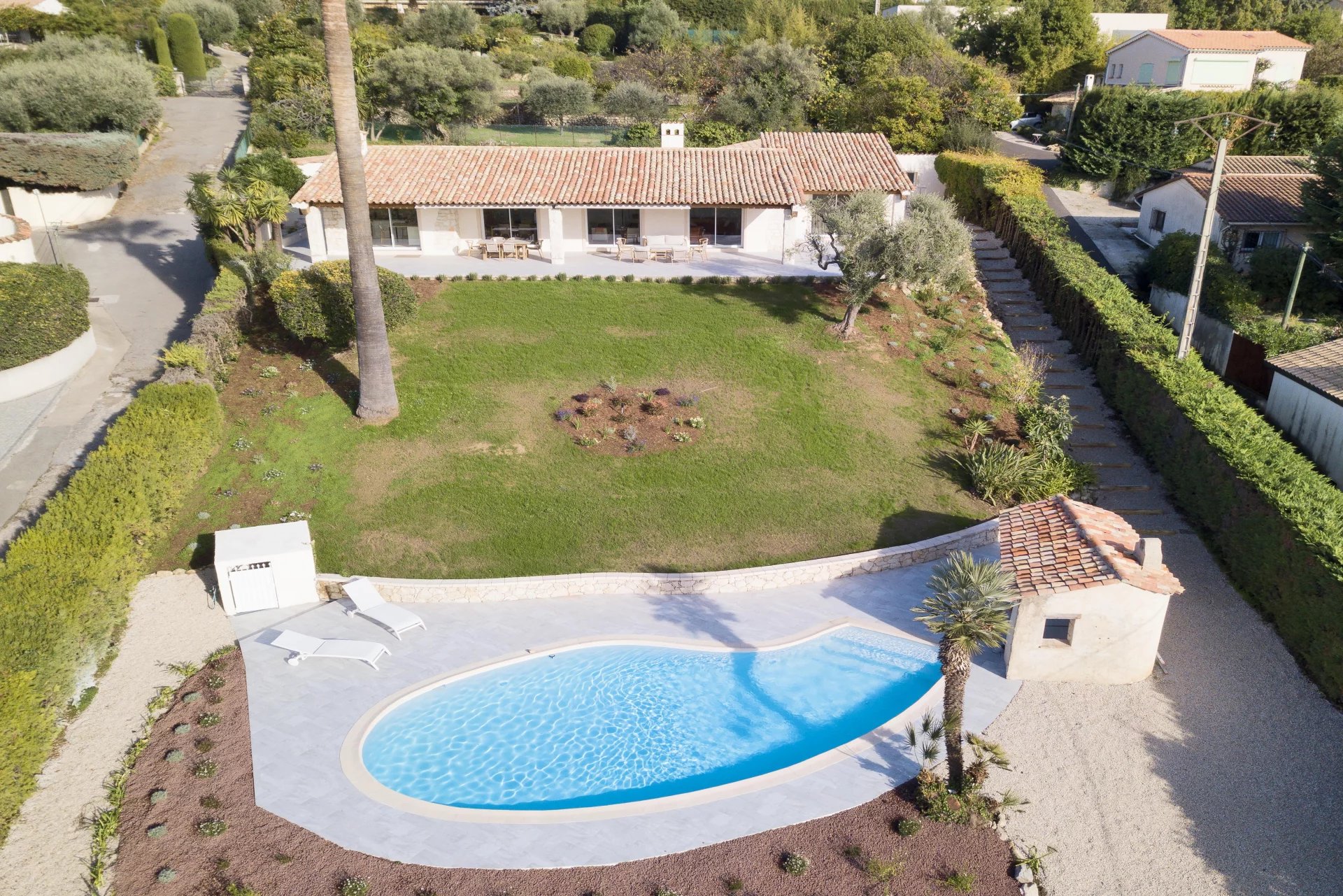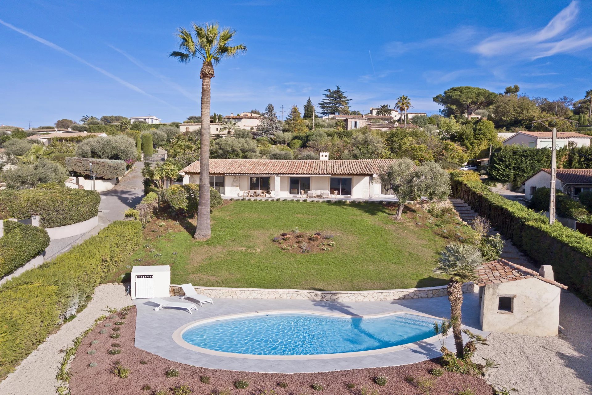 Exclusivité Vence : quartier résidentiel, belle villa entièrement rénovée avec des prestations de qualité exposée sud-ouest au calme absolu et bénéficiant d'une très belle vue dégagée sur le village de Saint-Paul-de-Vence; hall d'entrée, vaste et lumineux séjour, salle à manger, cuisine américaine équipée, cellier et buanderie, cave à vin, 3 chambres en suite dont une suite de maitre avec dressing, sauna et jacuzzi. Beau terrain complanté de 2200 m2 avec bel espace piscine. En annexe, appartement 3 pièces indépendant avec 2 chambres ensuite, salon et cuisine équipée, grande cave, abri 2 voitures, parkings