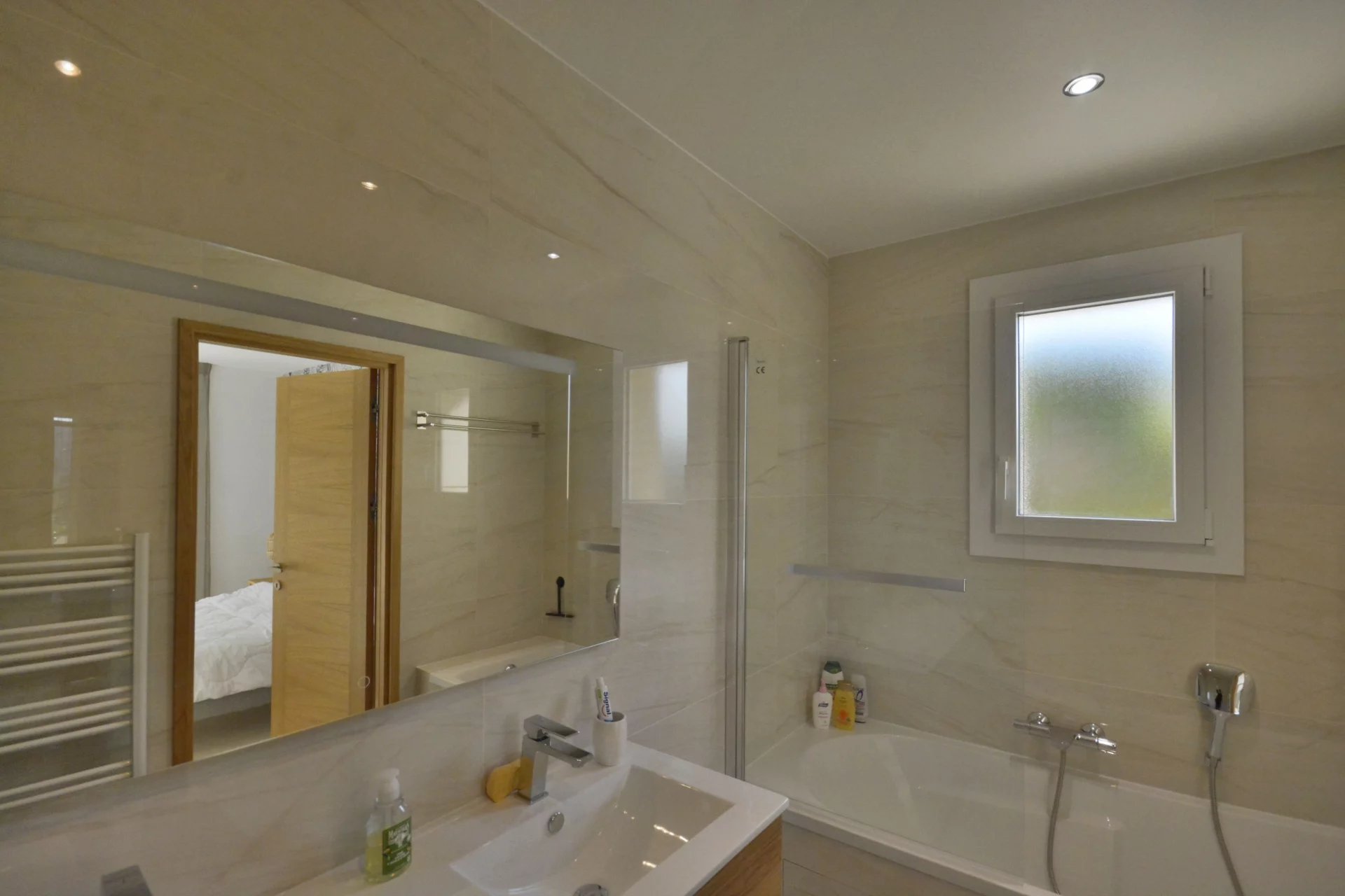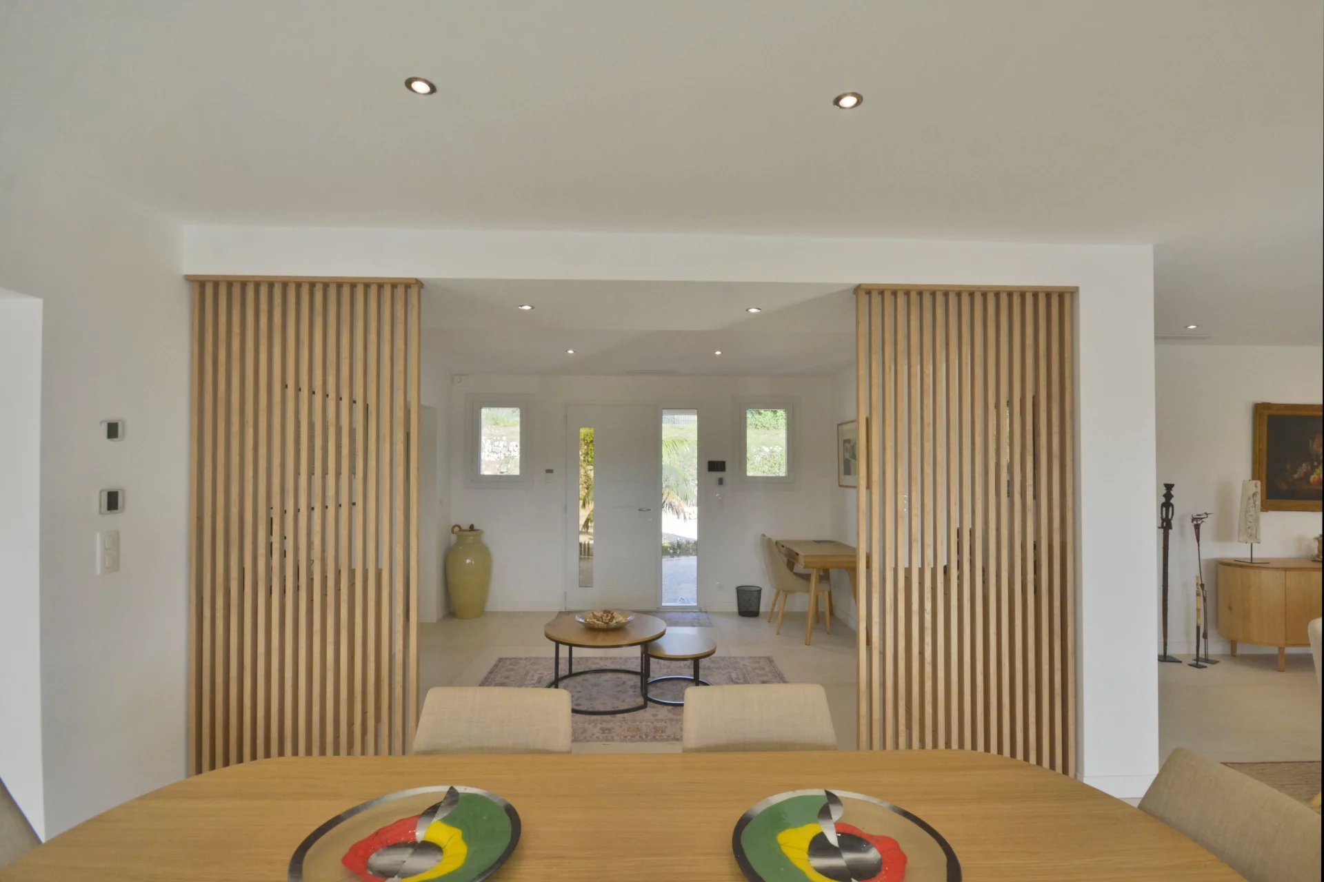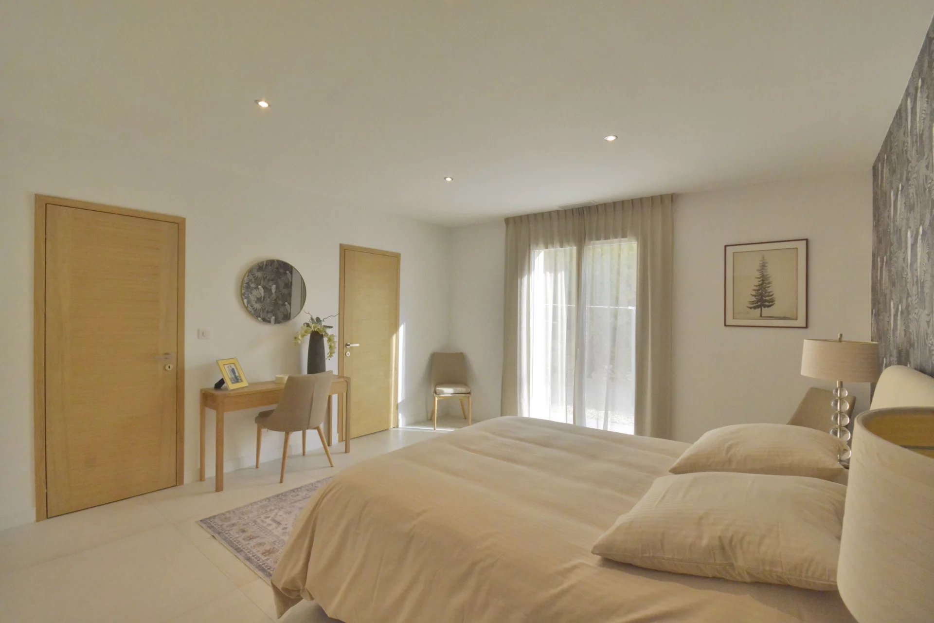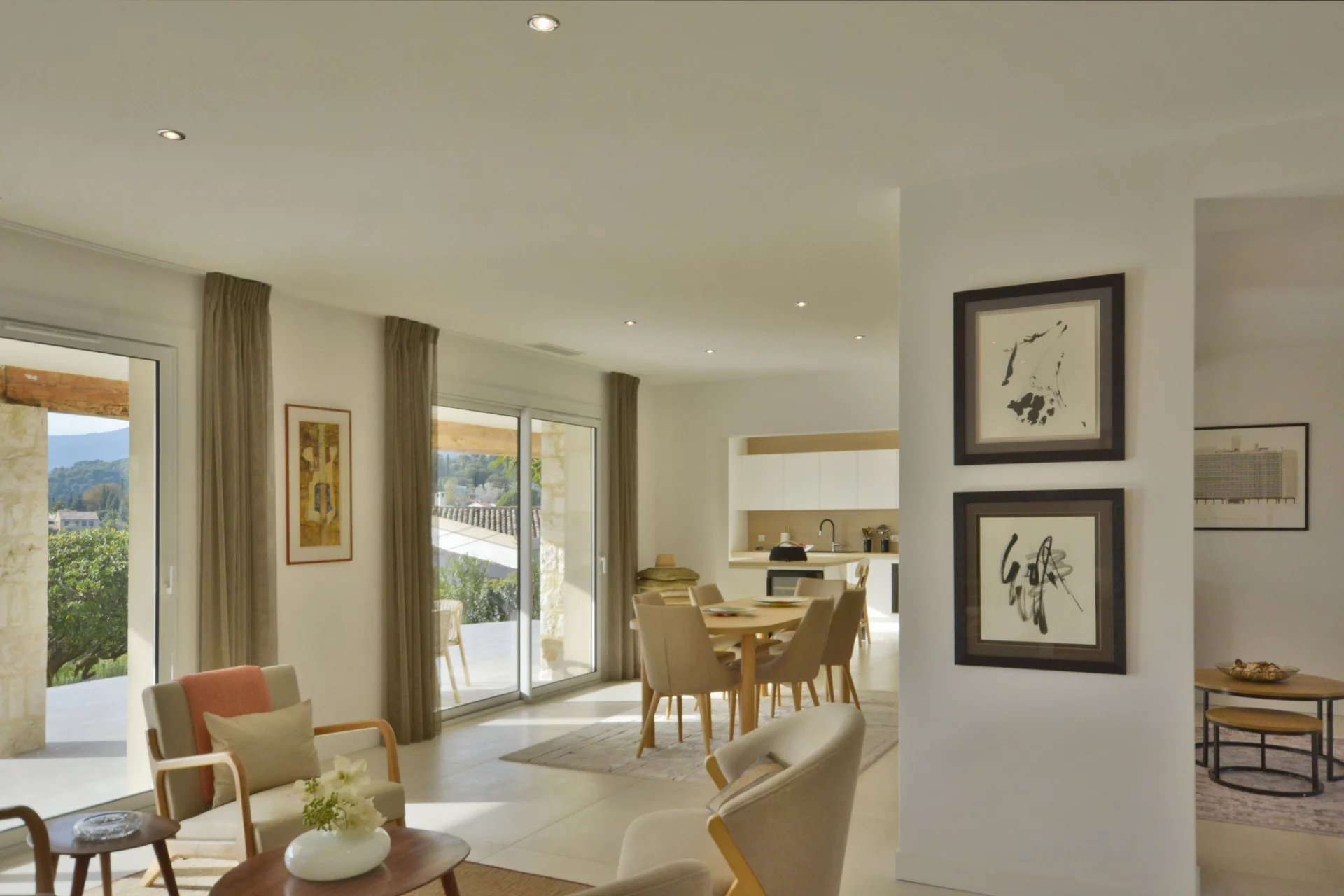 Exclusivité Vence : quartier résidentiel, belle villa entièrement rénovée avec des prestations de qualité exposée sud-ouest au calme absolu et bénéficiant d'une très belle vue dégagée sur le village de Saint-Paul-de-Vence; hall d'entrée, vaste et lumineux séjour, salle à manger, cuisine américaine équipée, cellier et buanderie, cave à vin, 3 chambres en suite dont une suite de maitre avec dressing, sauna et jacuzzi. Beau terrain complanté de 2200 m2 avec bel espace piscine. En annexe, appartement 3 pièces indépendant avec 2 chambres ensuite, salon et cuisine équipée, grande cave, abri 2 voitures, parkings